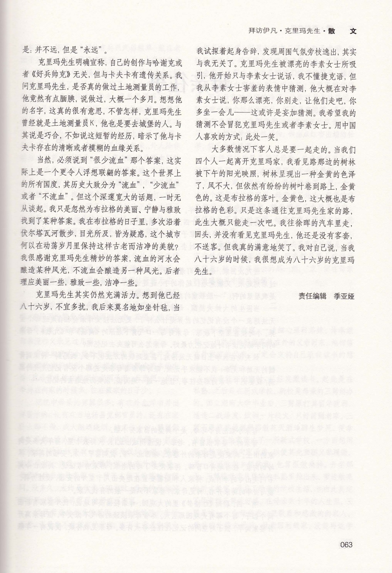 大多数情况下客人总是要一起走的。当我们四个人一起离开克里玛家,我看见路那边的树林被下午的阳光映照,树林呈现出一种金黄的色泽了,风不大,但依然有纷纷的树叶卷到路上,金黄色的。这是布拉格的落叶。金黄色,这大概也是布拉格的色彩。只是这条通往克里玛先生家的路,此生大概只能走一次吧。我往徐晖的汽车里走,回头,并没有看见克里玛先生,他还是没有客套,不送客。但我真的满意地笑了。我对自己说,当我八十六岁的时候,我很想成为八十六岁的克里玛先生。