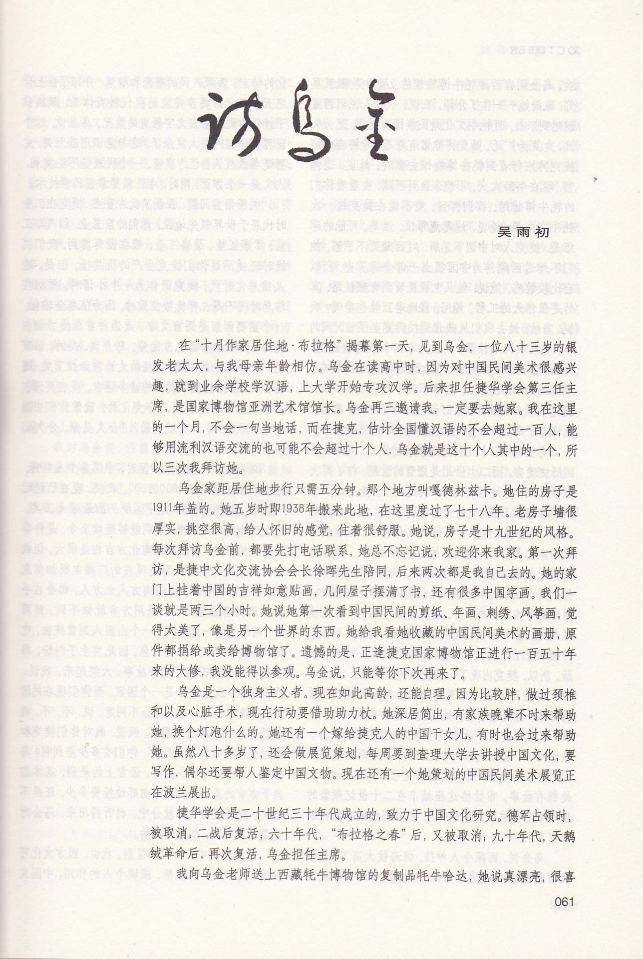 乌金家与居住地步行只需五分钟。那个地方叫嘎德林兹卡。她住的房子是1911年盖的。她五岁时即1938年搬来此地,在这里度过了七十八年。老房子墙很厚实,挑空很高,给人怀旧的感觉,住着很舒服。她说,房子是十九世纪的风格。每次拜访乌金前,都要先打电话联系,她总不忘记说,欢迎你来我家。第一次拜访,是捷中文化交流协会会长徐晖先生陪同,后来两次都是我自己去的。她的家门上挂着中国的吉祥如意贴画,几间屋子摆满书,还有很多中国字画。我们一谈就是两三个小时。她说她第一次看到中国民间的剪纸、年画、剌绣,风筝画,觉得太美了,像是另一个世界的东西。她给我看她收藏的中国民间美术的画册,原件都捐给或卖给博物馆了。遗憾的是,正逢捷克国家博物馆正进行一百五十年来的大修,我没能得以参观。乌金说,只能等你下次再来了。