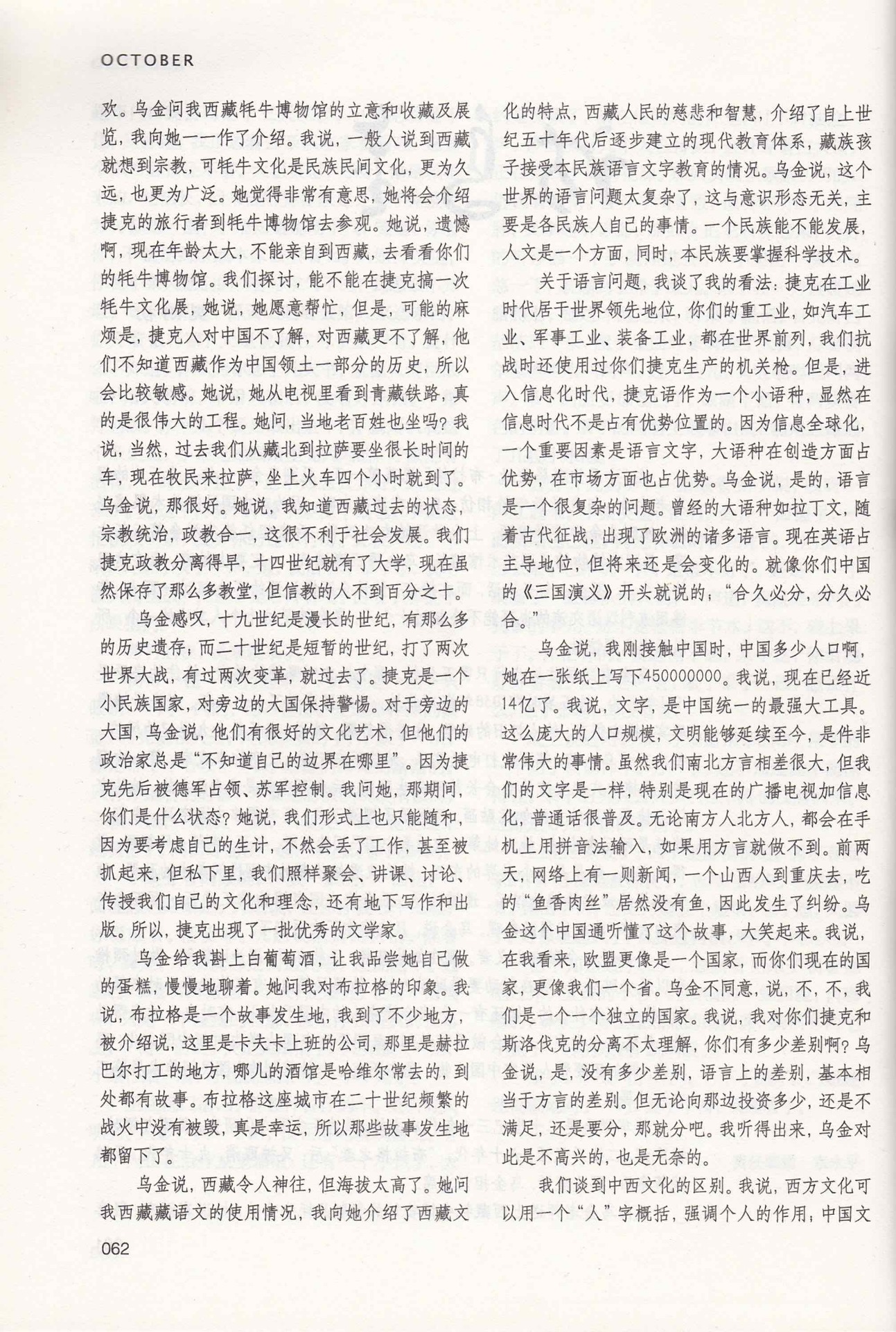 关于语言问题,我谈了我的看法:捷克在工业时代居于世界领先地位,你们的重工业,如汽车工业、军事工业,都在世界前列,我们抗战时还使用过捷克的机关枪。但是,进入信息化时代,捷克语作为一个小语种,显然在信息时代不是占有优势位置的。因为信息全球化,一个重要因素是语言文字,大语种在创造方面占优势,在市场方面也占优势。乌金说,是的,语言是一个很复杂的问题。曾经的大语种如拉丁文,随着古代征战,出现了欧洲的诸多语言。现在英语占主导地位,但将来还是会变化的。就像你们中国的《三国演义》开头就说的;"合久必分,分久必合。"