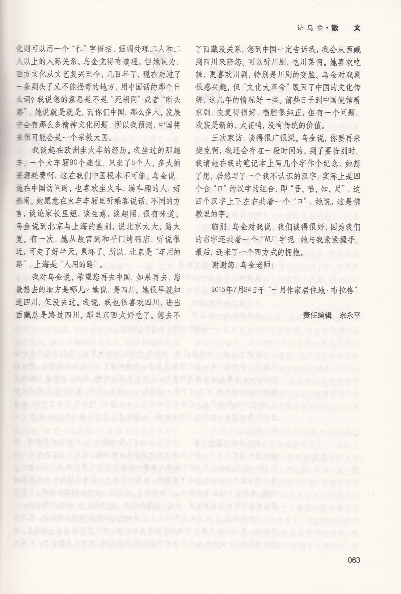 临别,乌金对我说,我们谈的很好,因为我们的名字还共着一个"wu"字呢,她与我紧紧握手,最后,还来了一个西方式的拥抱。